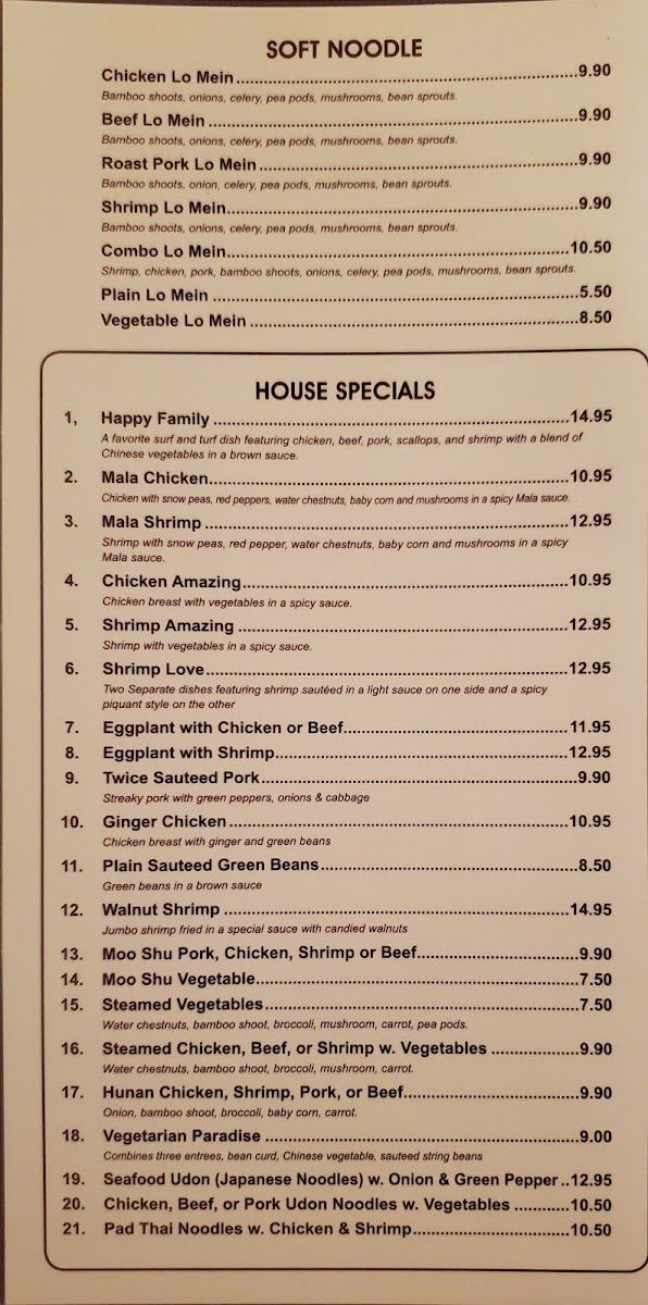 Lunch takeout piping hot, with generous portions, satisfying flavors, perfectly-cooked veggies! Took it to McHose Park and regretted nothing Garlic chicken as well as beef with snow peas especially pleased the whole family. Would love to try one of the mala dishes, next time, or the eggplant!