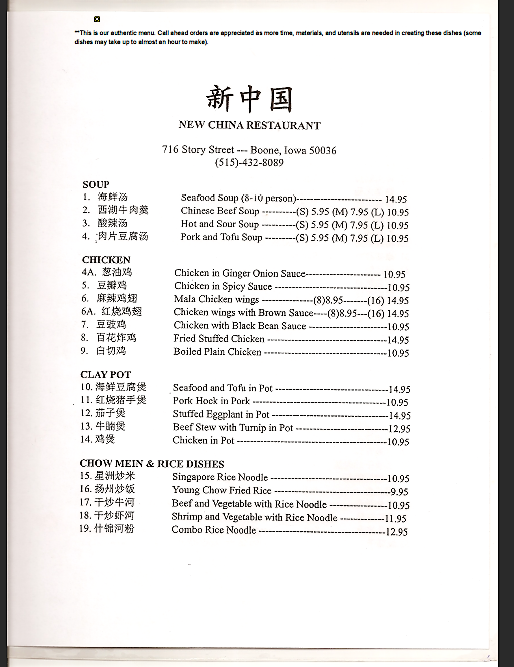 New China Restaurant - Boone Menu